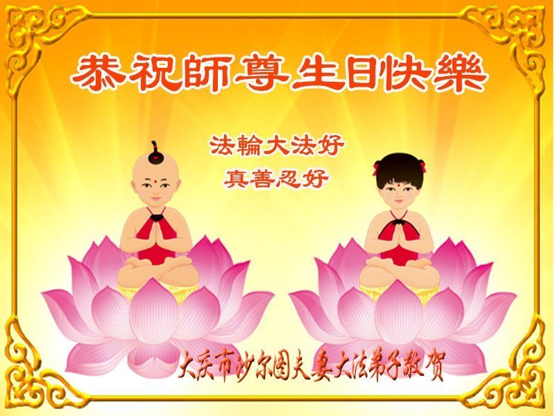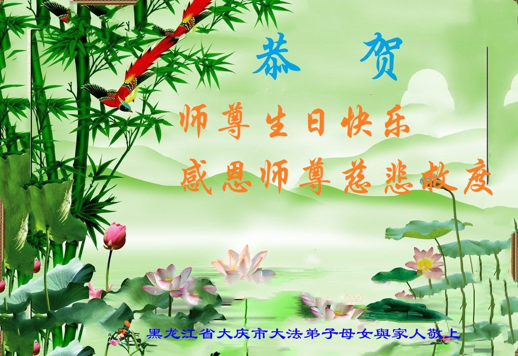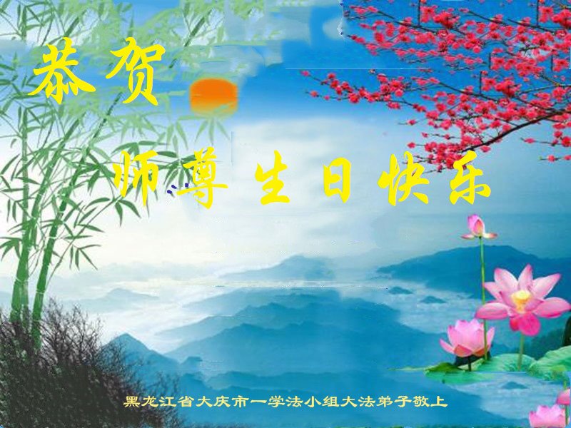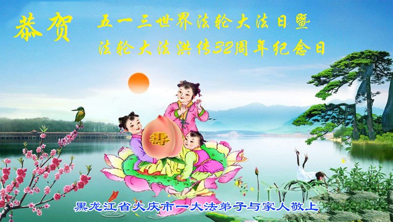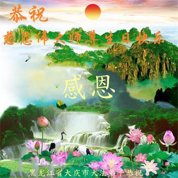 黑龙江大庆市一大法弟子全家恭贺世界法轮大法日!恭祝师尊生日快乐!
