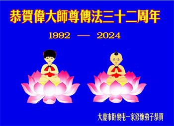 黑龙江省大庆市卧里屯一家修炼弟子恭贺伟大师尊传法三十二周年!