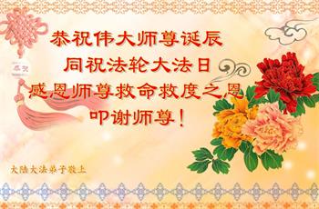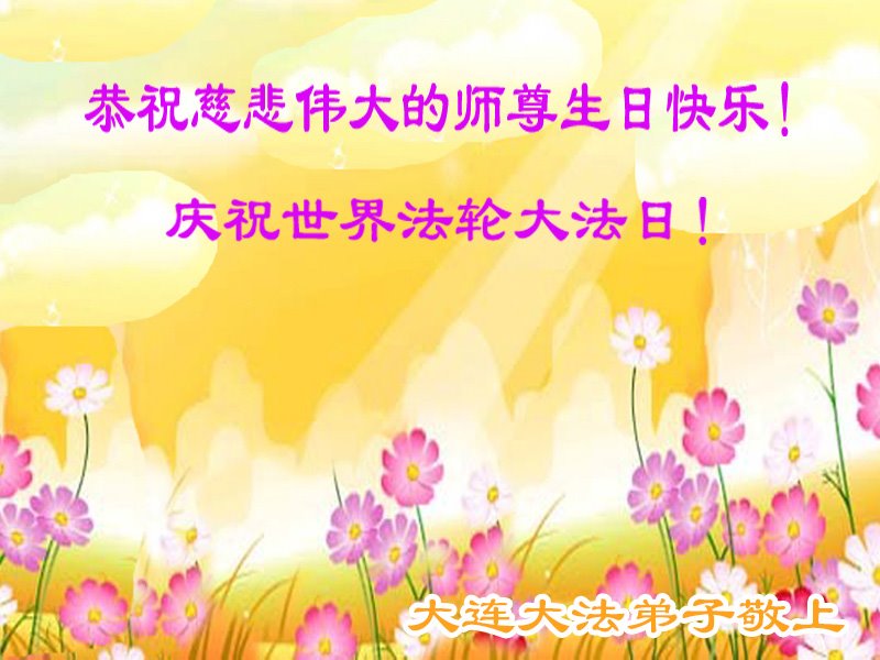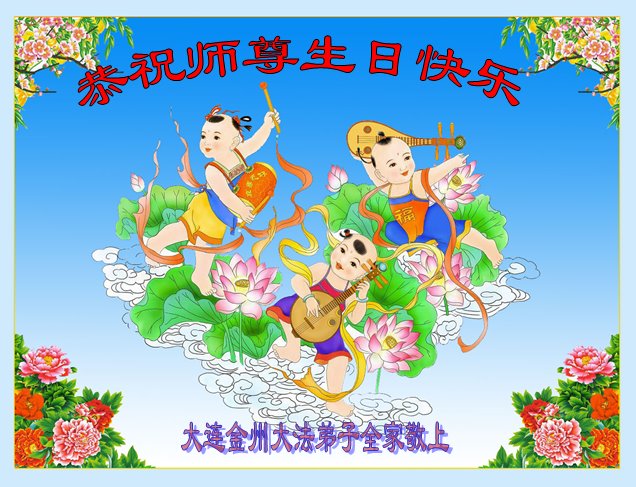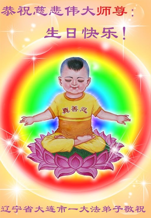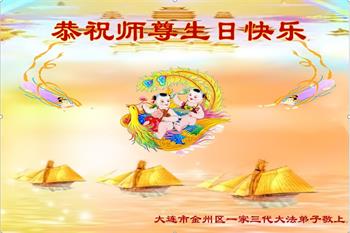 恭祝慈悲伟大的师尊生日快乐!感恩师尊救度了我们全家!跪拜师尊!恭贺5·13世界法轮大法日。 辽宁省大连市一大法弟子全家敬上 大连一大法弟子恭祝师尊生日快乐!
