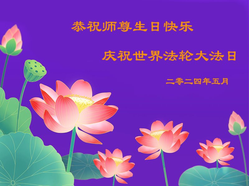 师尊好!我今年五十四岁,在一九九四年有幸聆听师尊讲法,知道大法好,但是一直没真正的走進来。二零一五年我得了一场突如其来的急症,身边认识的大法弟子,告诉我学炼法轮功,我就开始炼功学法了,身体慢慢就好起来了,晚上也能睡着觉了,心也不慌了,我真正走入大法的修炼中来直到今日,在这期间一直坚持学法炼功。感谢师尊的慈悲救度,在第二十五届世界法轮大法日来临之际,叩拜师尊!恭祝师尊生日快乐! 辽宁大连大法弟子敬上 二零二四年五月 辽宁大连大法弟子恭祝师尊生日快乐!