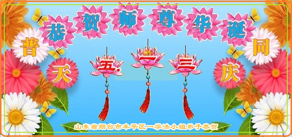 在这宇宙最神圣最伟大的日子来临之际,在这普天同庆的日子里,弟子们以最敬仰的心向慈悲伟大的师尊敬上最真诚的问候。 山东烟台莱州驿道镇全体大法弟子叩拜 山东省烟台市牟平区一学法小组大法弟子恭祝师父生日快乐!