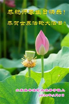 弟子珍惜这万古机缘, 珍惜师父用巨大承受为我们延长来的时间,感恩师父为大法弟子的悉心看护和操劳,共同走好修炼中的每一步,精進不怠,做好三件事,不负师恩与众生的重托,做师父所要的,跟师父回家! 山东烟台开发区一学法组大法弟子敬上 二零二四年五月八日 山东曲阜法轮大法弟子恭祝师尊生日快乐!