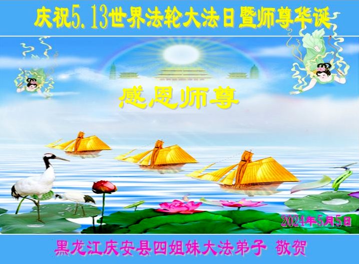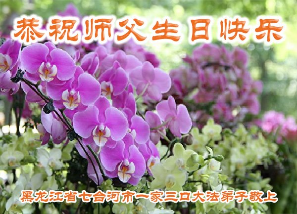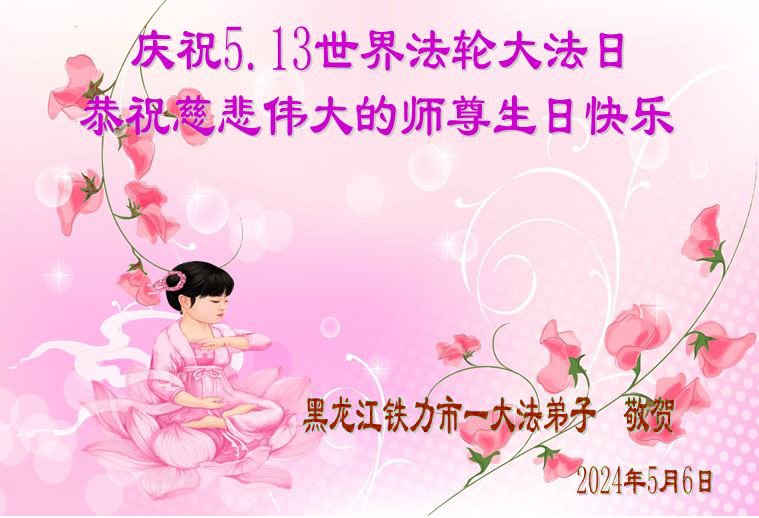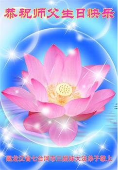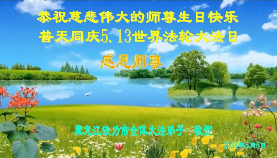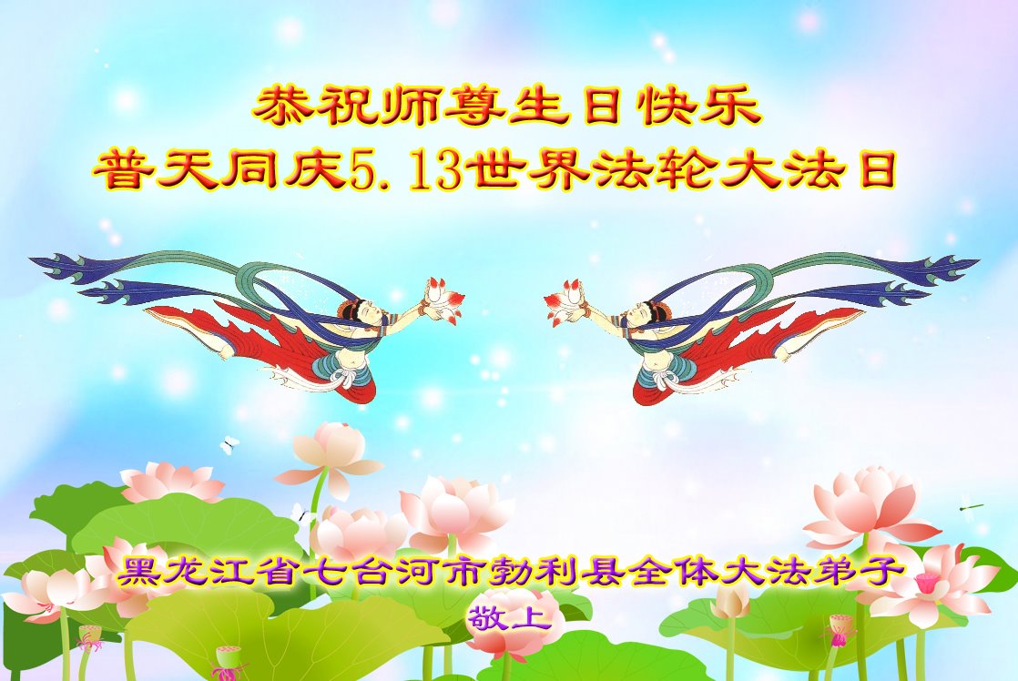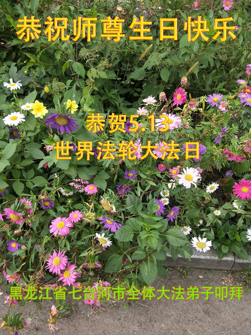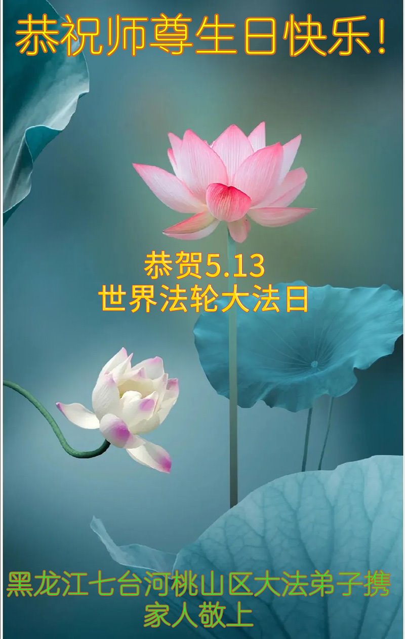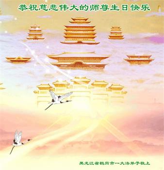 恭贺法轮大法日!恭祝师父生日快乐! 师父您好;师父辛苦了!谢谢师父对我们全体大法弟子的保护,感恩师父的慈悲救度,谢谢师父! 黑龙江省七台河市全体大法弟子敬上 黑龙江大法弟子恭贺世界法轮大法日!