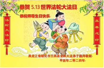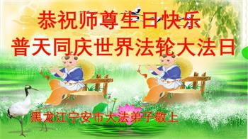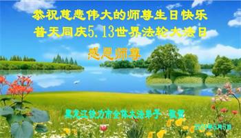 恭贺世界法轮大法日! 黑龙江省大法弟子恭贺世界法轮大法日!恭祝李洪志师父生日快乐!