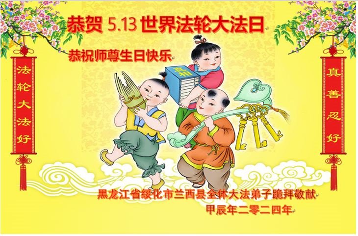 恭祝师尊生日快乐!感恩师尊慈悲救度! 黑龙江省绥化市兰西县全体大法弟子恭贺5.13世界法轮大法日!恭祝师尊生日快乐!