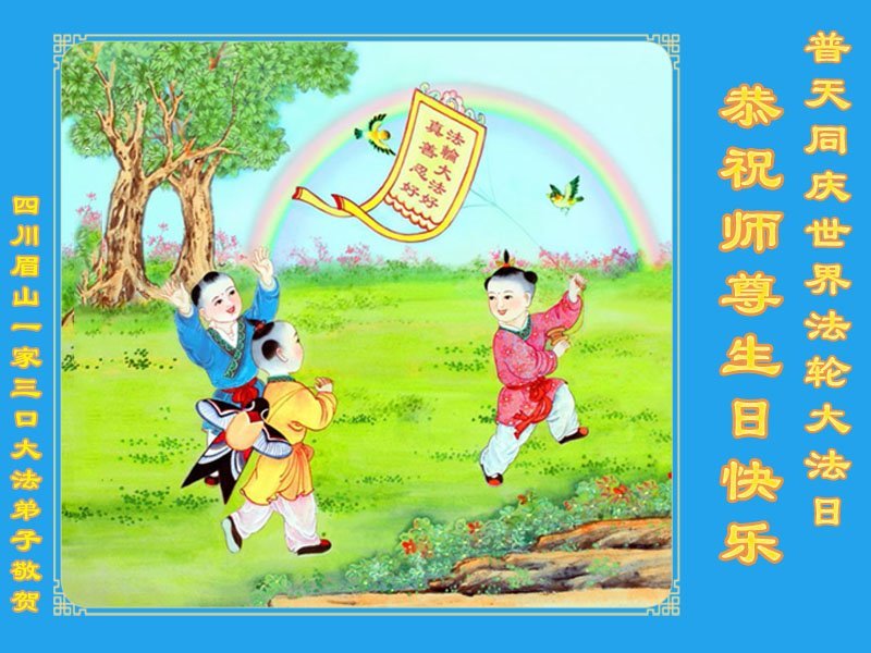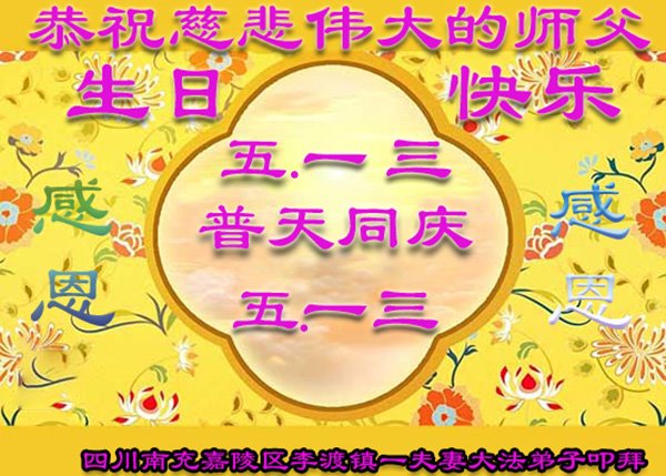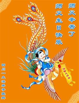 感谢师父洪传大法救度众生!弟子们要一如既往做好三件事,认真学好法,向内找,提高心性,修好自己,多讲真相,多救人,不辜负师父的浩荡洪恩。 四川一大法弟子恭祝师尊生日快乐!