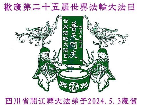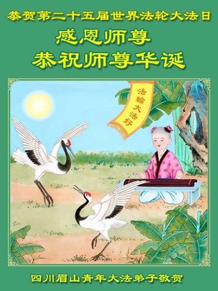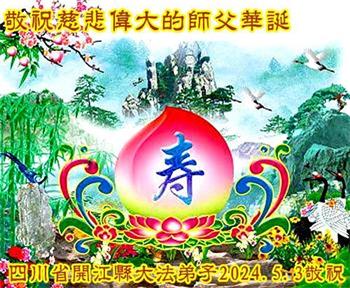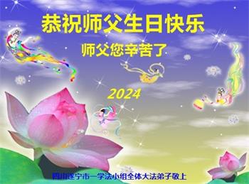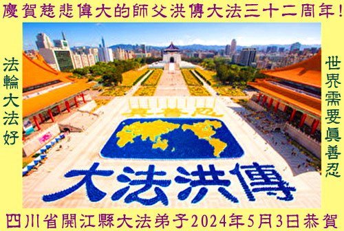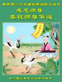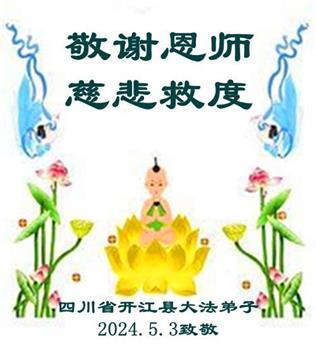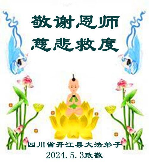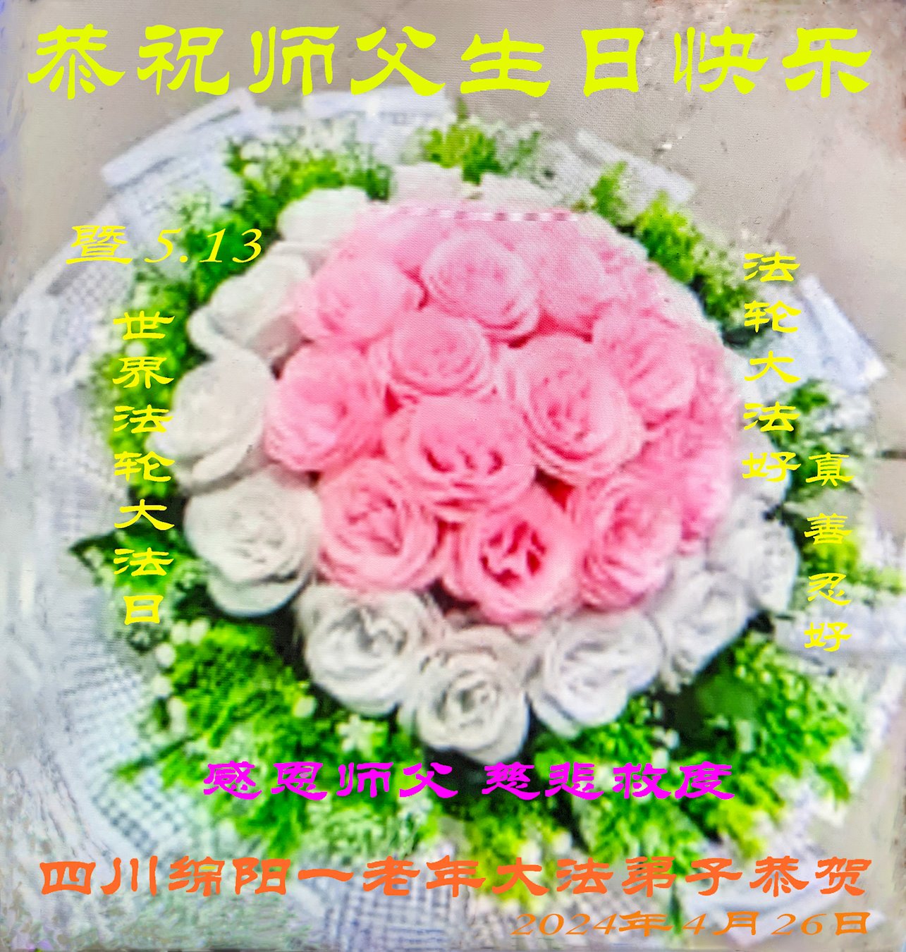在这世界大法弟子最神圣伟大的5.13即将来临之际,我以最诚敬的心情,祝贺伟大师父正法取得最大胜利!真心希望师父回到中国大陆与大陆弟子相见。我们一定按师父的教导学好法,做好三件事;希望能在师父的引领下回到大法弟子的家园。 四川绵阳一老年大法弟子敬上 2024年4月26日 四川眉山青年大法弟子庆祝法轮大法日!感恩师尊慈悲救度!恭贺师尊华诞!