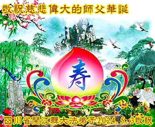 恭祝伟大慈悲的师父生日快乐! 师尊您辛苦了!在五一三这个殊圣的日子到来之际,首先恭祝伟大慈悲的师父生日快乐!普天同庆同贺大法洪传三十二周年暨第二十五届世界法轮大法日! 四川南充顺庆西城四人学法小组全体大法弟子叩拜 二零二四年五月五日 四川南充嘉陵区一夫妻大法弟子恭祝慈悲伟大的师父生日快乐!