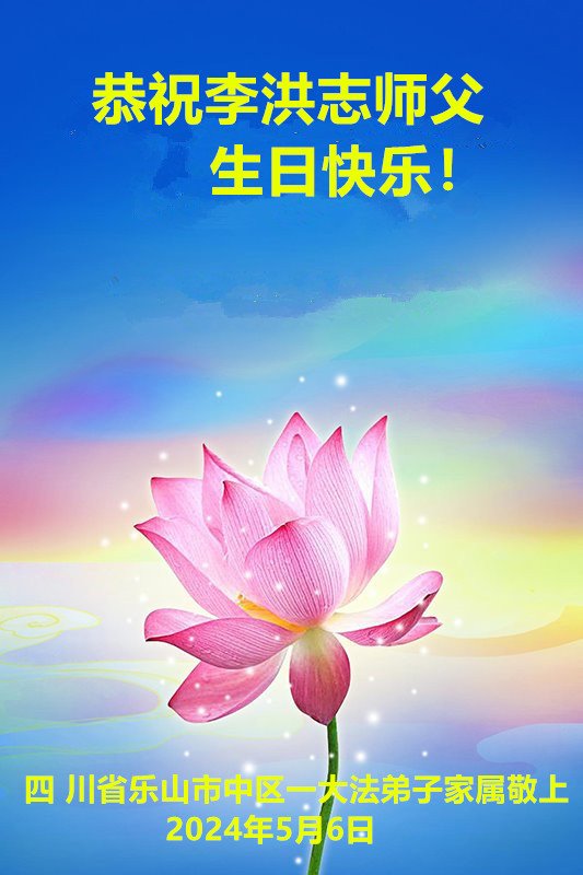 恭祝慈悲伟大的师父生日快乐! 师尊您辛苦了! “在五‧一三”这个殊圣的日子到来之际,首先恭祝伟大慈悲的师父生日快乐!普天同庆同贺大法洪传三十二周年暨第二十五届世界法轮大法日! 感恩伟大慈悲的师父救命之恩!弟子一定要做好三件事,多学法,学好法,多救人。 四川南充嘉陵区一夫妻大法弟子叩拜 二零二四年五月五日 四川省乐山市中区一大法弟子家属恭祝李洪志师父生日快乐!