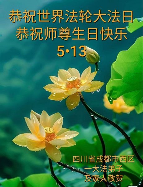 恭贺法轮大法洪传三十二周年!恭贺五∙一三世界法轮大法日! 盼师归 师华诞 天地歌 五∙一三 普天庆 师恩重 无以报 唯真修 不懈怠 盼师归 紧除恶 佛光照 送祥和 四川成都德阳一中年大法弟子跪拜 四川省成都市一大法弟子全家恭祝师尊生日快乐!