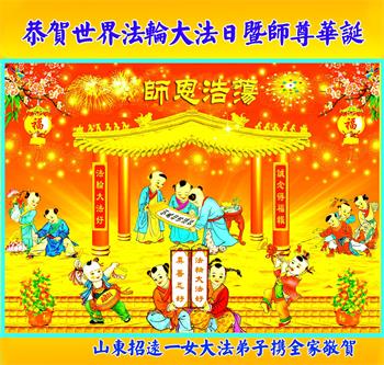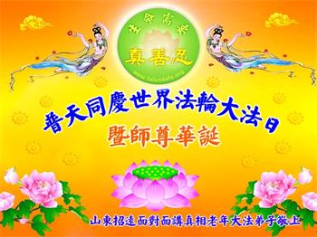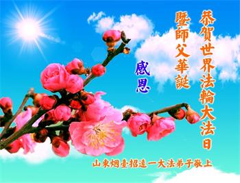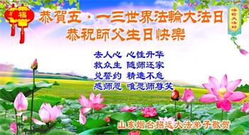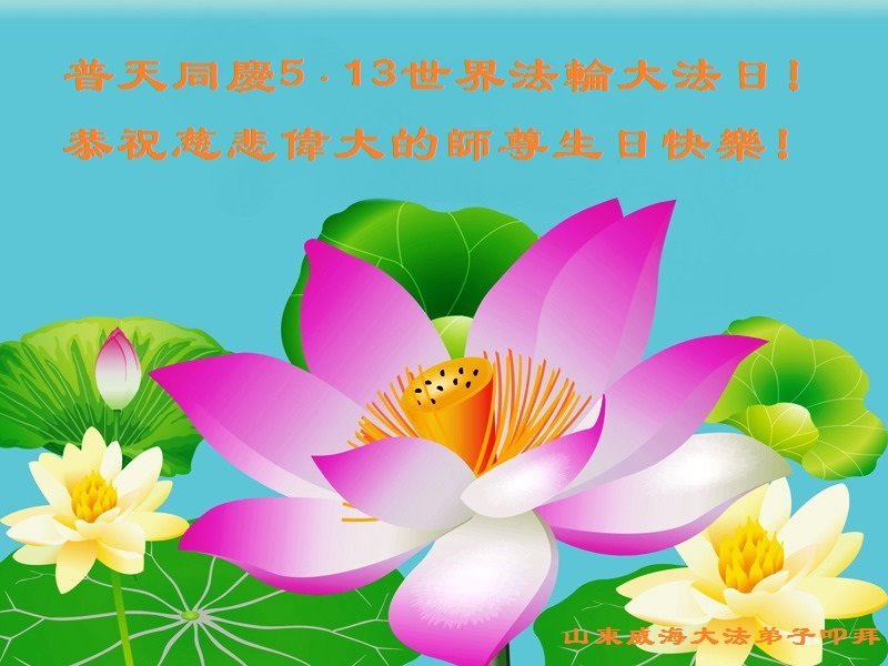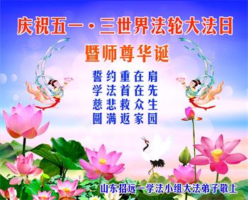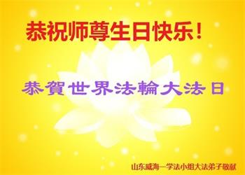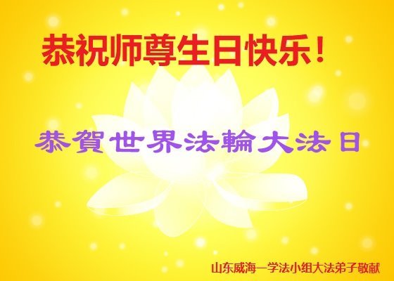 山东威海大法弟子恭贺世界法轮大法日!恭祝慈悲伟大的师尊生日快乐!