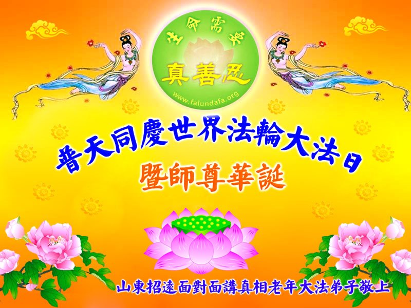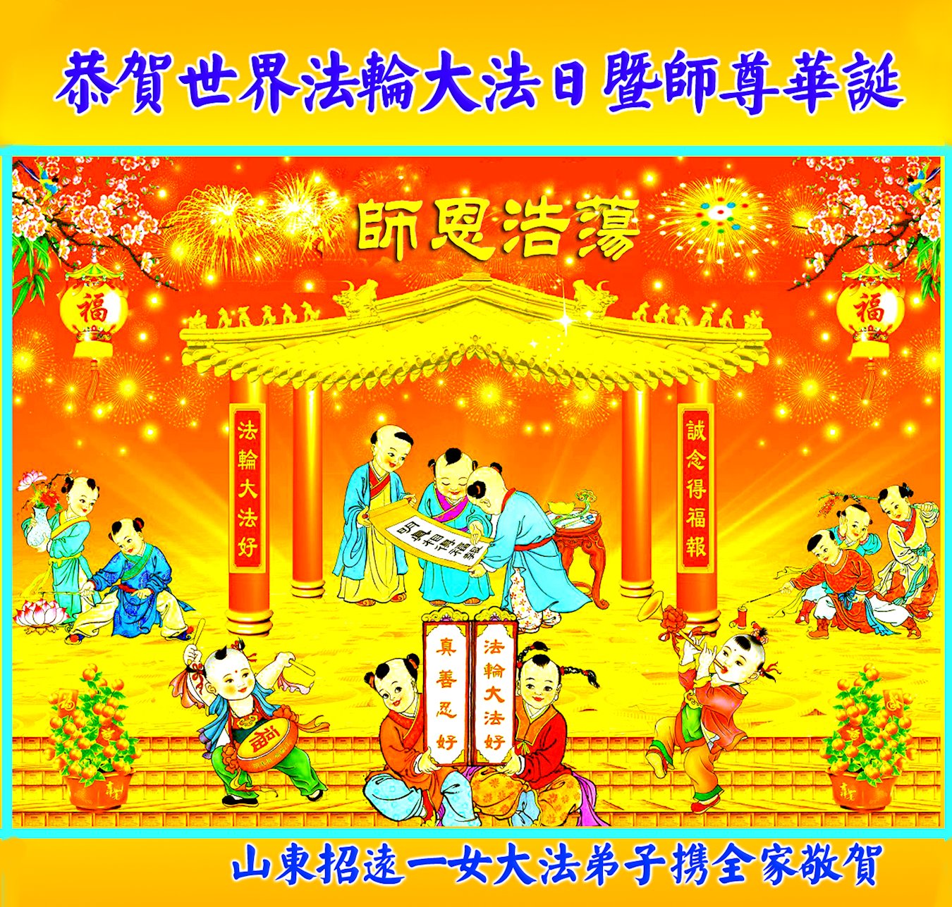 师恩浩荡,佛法无边。师尊为救众生于坏灭历经千万年轮回转世,铺垫着人类文化看守着人类道德,使宇宙大法洪传世界,荡涤着一切污泥浊水。我是师尊选中的大法徒,为完成自己的使命,我全身心投入到救众生行列中,讲真相、发资料,赶集、下乡、走街串巷找有缘人,再苦再累心里甜,因为我有众神都羡慕的头衔一一大法弟子。弟子万分感恩师父的慈悲救度与保护。 在此我恭祝师尊生日快乐暨世界法轮大法日二十五周年! 山东省烟台市招远市一女大法弟子携全家敬上 山东省烟台市招远市面对面讲真相老年大法弟子恭贺法轮大法日暨师尊华诞!