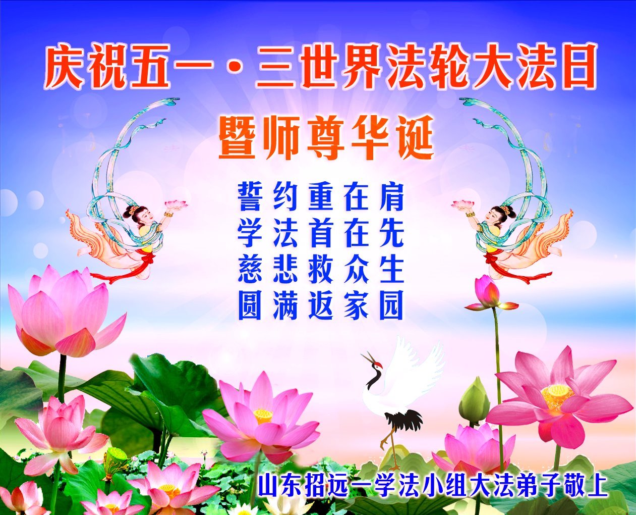 山东省烟台市招远市一学法小组大法弟子庆祝五一·三世界法轮大法日暨师父华诞!