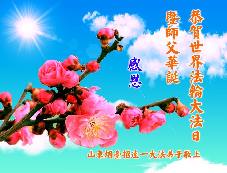 恭祝慈悲伟大的师尊生日快乐!感恩师尊慈悲救度!去人心 心性升华 救众生 随师还家 兑誓约 精進不怠 感师恩 惟愿师尊笑 山东烟台招远一大法弟子恭贺世界法轮大法日暨师父华诞!