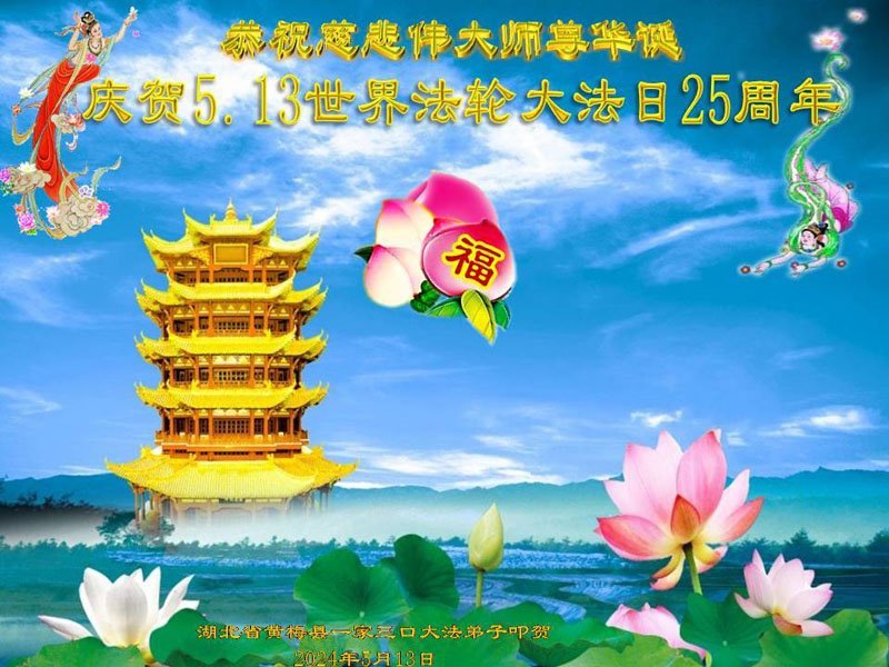 湖北省黄冈市黄梅县一家三位大法弟子恭祝师尊华诞暨庆贺世界法轮大法日!