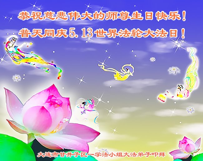 恭祝伟大的师尊生日快乐!恭贺世界法轮大法日! 辽宁省大连市甘井子区一大法弟子恭祝师尊生日快乐!恭贺五‧一三世界法轮大法日!