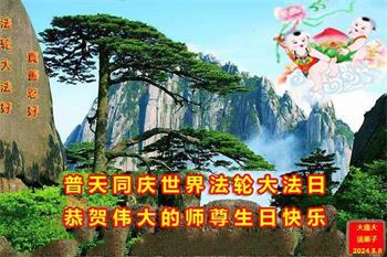 在世界法轮大法日和师尊华诞即将来临之际,我们两个学法小组九名大法弟子恭贺法轮大法弘传32周年!恭祝师父生日快乐! 师恩浩荡,无法用语言表述对师尊的感恩与救度,只有听师尊的话,做好三件事,学好法,实修自己、多救人,兑现史前大愿,惟愿师尊笑! 辽宁大连泡崖大法弟子敬上 二零二四年五月八日 辽宁大连一新大法学员恭祝师父生日快乐!