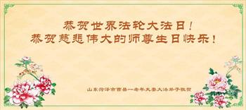 山东菏泽市曹县一老年夫妻大法弟子敬贺世界法轮大法日!