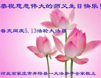 河北省石家庄市井陉县一大法弟子全家恭祝慈悲伟大的师父生日快乐!感谢师父的慈悲救度!