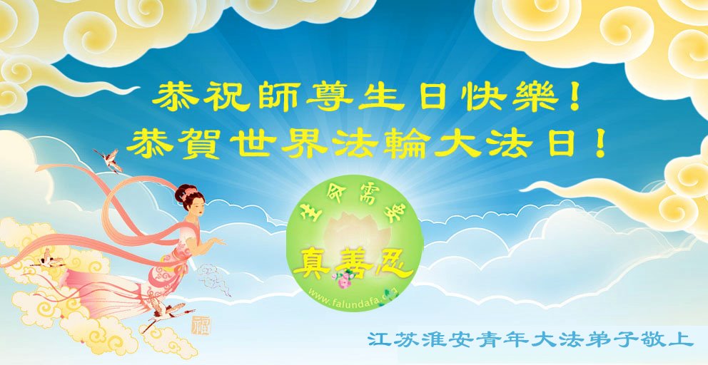 普天同庆世界法轮大法日! 拜读师父面向全人类发表的新经文,用尽人类的语言也无法表达对师尊的无限敬仰和感恩。 创世主的法光正在把末后的浊世照亮,众生,好好珍惜,快续圣缘。拜谢慈悲伟大的师父! 江苏省淮安青年大法弟子恭贺世界法轮大法日!