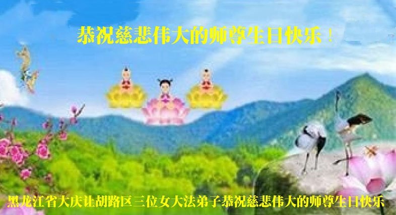 黑龙江省大庆让胡路区三位女大法弟子恭祝慈悲伟大的师尊生日快乐!