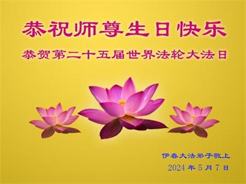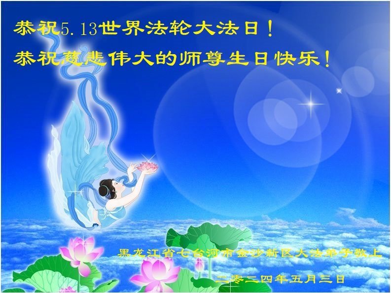 【明慧网二零二四年五月十三日】 黑龙江省七台河市金沙新区大法弟子恭祝慈悲伟大的师尊生日快乐!