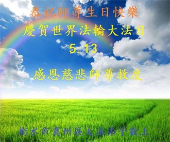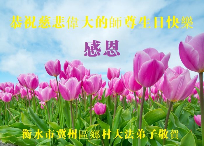 法轮大法普天照 师父在上弟子叩头 法中的粒子 佛恩浩荡震九霄 叩拜师父再叩拜 新宇宙正觉 众生得救传喜报 师恩难报师恩重 助师正法 生命从今有依靠 在身使命完成好 正天正地正人道 得救不忘师尊恩 三件事做好是使命 得救的生命在欢呼 再看新宇众生笑 亿万年等待今生了 败坏的生命遭恶报 感恩 慈悲伟大的师父 弟子的感恩无法用人类的语言描述 洗净更新造大穹 救众生 佛恩浩荡 沐春风 度众生 通天法力灭恶灵 手牵众生 业债一身当 为了众生耗尽一生 神体斑伤 弟子无以报 完成使命报师恩 河北省沧州青县大法弟子敬上 河北省衡水市冀州區大法弟子恭祝师尊生日快乐!