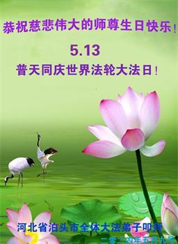 河北省沧州市泊头市全体大法弟子恭祝慈悲伟大的师尊生日快乐!恭贺世界法轮大法日!