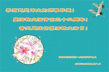普天同庆世界法轮大法日! 谢谢师尊的慈悲救度!弟子叩拜师尊! 弟子谨记师尊的教诲,努力做好三件事,修好自己,与同修配合好,救度更多的众生! 家属祝师尊生日快乐!恭贺世界法轮大法日! 辽宁抚顺望花一大法弟子敬上 二零二四年五月八日 辽宁抚顺望花一大法弟子恭祝慈悲伟大的师尊华诞!