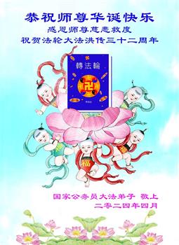 国家公务员大法弟子恭祝师尊华诞快乐暨法轮大法洪传三十二周年! 恭祝师尊华诞快乐! 感恩师尊慈悲救度 祝贺法轮大法洪传三十二周年! 国家公务员大法弟子敬上 中国大陆一大法弟子敬贺世界法轮大法日!
