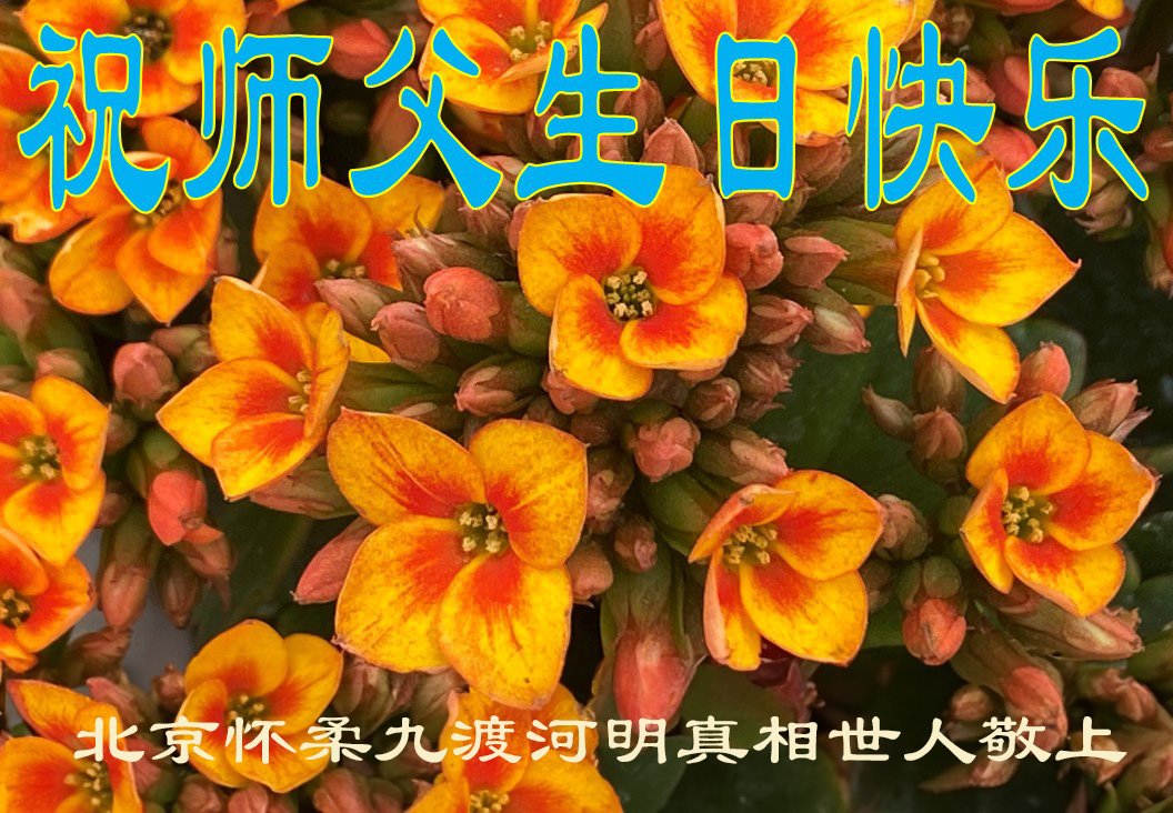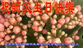 大法师父好!感恩大法师父慈悲救度! 北京昌平南口明真相世人敬上 北京市怀柔区九渡河镇明真相世人代表家里八口人祝愿大法师父生日快乐!