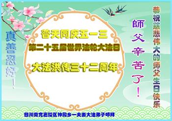 我现在虽然没修炼,但我知道大法好,真善忍好,我一定听师父的话,按真善忍做个好人。 四川射洪大法弟子恭祝师尊生日快乐!恭贺世界法轮大法日!