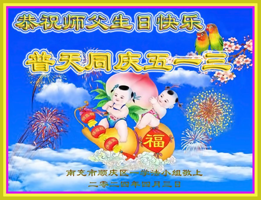 恭祝慈悲伟大的师尊生日快乐!恭贺5.13世界法轮大法日! 师父好!弟子让师父操心了!弟子虽在难中,在迷中,有师在,有法在,弟子是全宇宙最幸运的生命,谢谢师父!唯有做好三件事,方不辜负师尊再造之恩! 四川遂宁三人学法小组大法弟子敬上 二零二四年四月二十七日 四川省南充市顺庆区一学法小组全体大法弟子恭祝师父生日快乐!普天同庆五·一三!