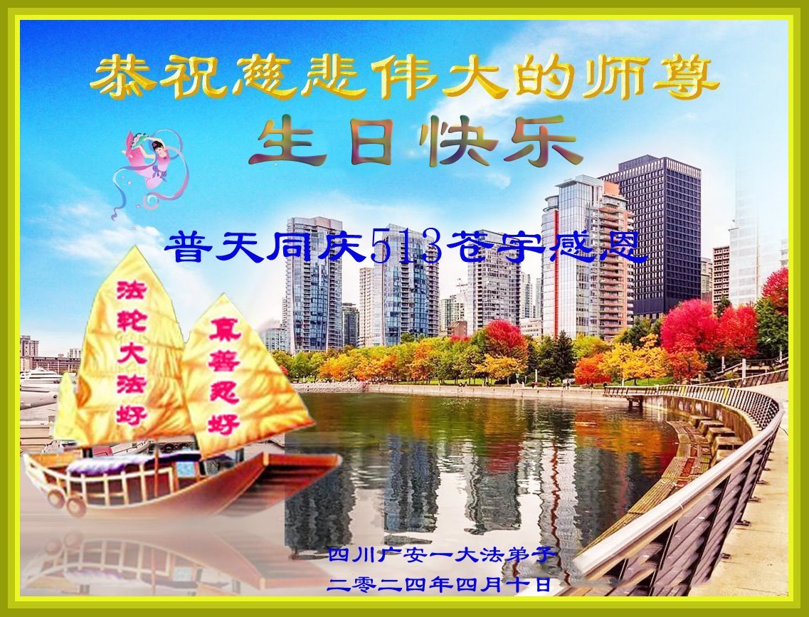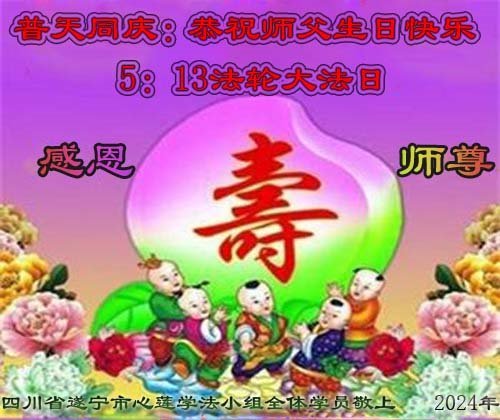 尊敬的师父好!师父辛苦了!祝师父生日快乐! 五一三是个特别的日子,全世界大法弟子同庆同喜同乐的日子,而我们大陆大法弟子却不能够像其他国家的弟子那样恭贺,而是默默的在学法小组庆祝这个美好的日子,弟子只有遵照师父的教诲,做好三件事,多救人,跟师父回家。感恩师父的慈悲救度!感谢师父的一路保护! 四川广安一大法弟子敬上 二零二四年四月十日 四川省遂宁市学法小组大法学员敬祝慈悲伟大的师父生日快乐!同庆五一三法轮大法日!