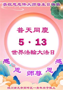 恭祝师父生日快乐!恭贺5.13世界法轮大法日!师父谢谢您!在这普天同庆的日子里,一句谢谢怎能道尽弟子满腹千言万语。漫漫路终将尽盼师归,兑誓约救人忙志不退,待他日恶灭尽众生醒,普天庆谢主恩洒慈悲。 四川省射洪市大法弟子敬上 四川省德阳市广汉市一母女大法弟子及不修炼的全体家人恭祝慈悲伟大的师尊生日快乐!
