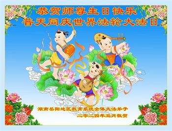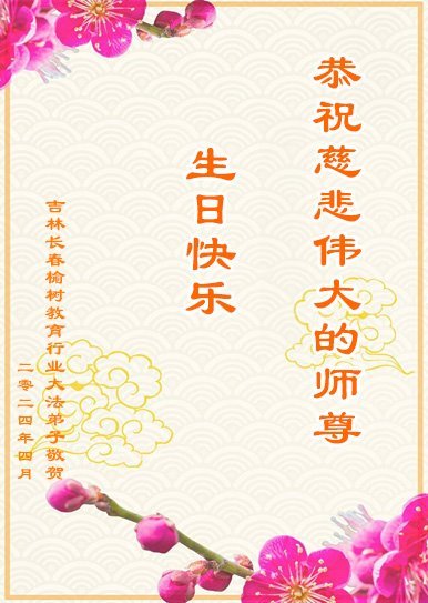 吉林省长春市榆树市教育行业大法弟子敬上 二零二四年四月 湖南省岳阳地区教育系统全体大法弟子恭祝慈悲伟大的师尊生日快乐!