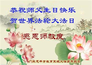 恭祝慈悲伟大的师尊生日快乐!普天同庆世界法轮大法日。 湖南省岳阳地区教育系统全体大法弟子敬上 广东省江门市恩平市教育系统大法弟子恭祝师父生日快乐!