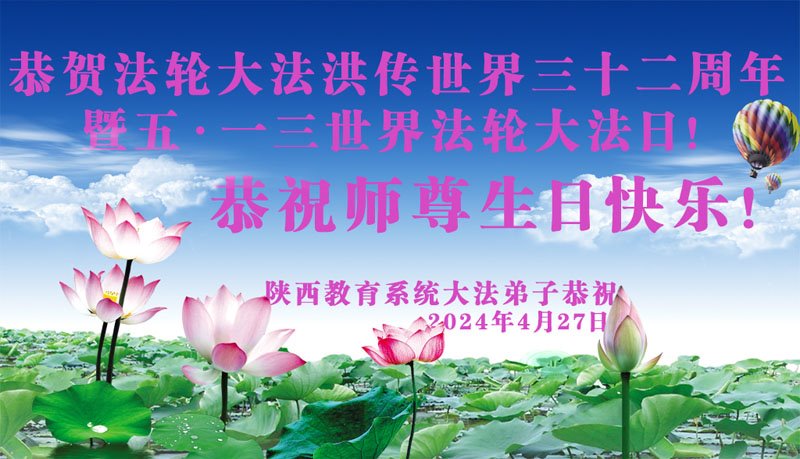 陕西教育系统大法弟子恭祝慈悲伟大的师尊生日快乐!恭贺世界法轮大法日!感谢伟大的师父慈悲救度!