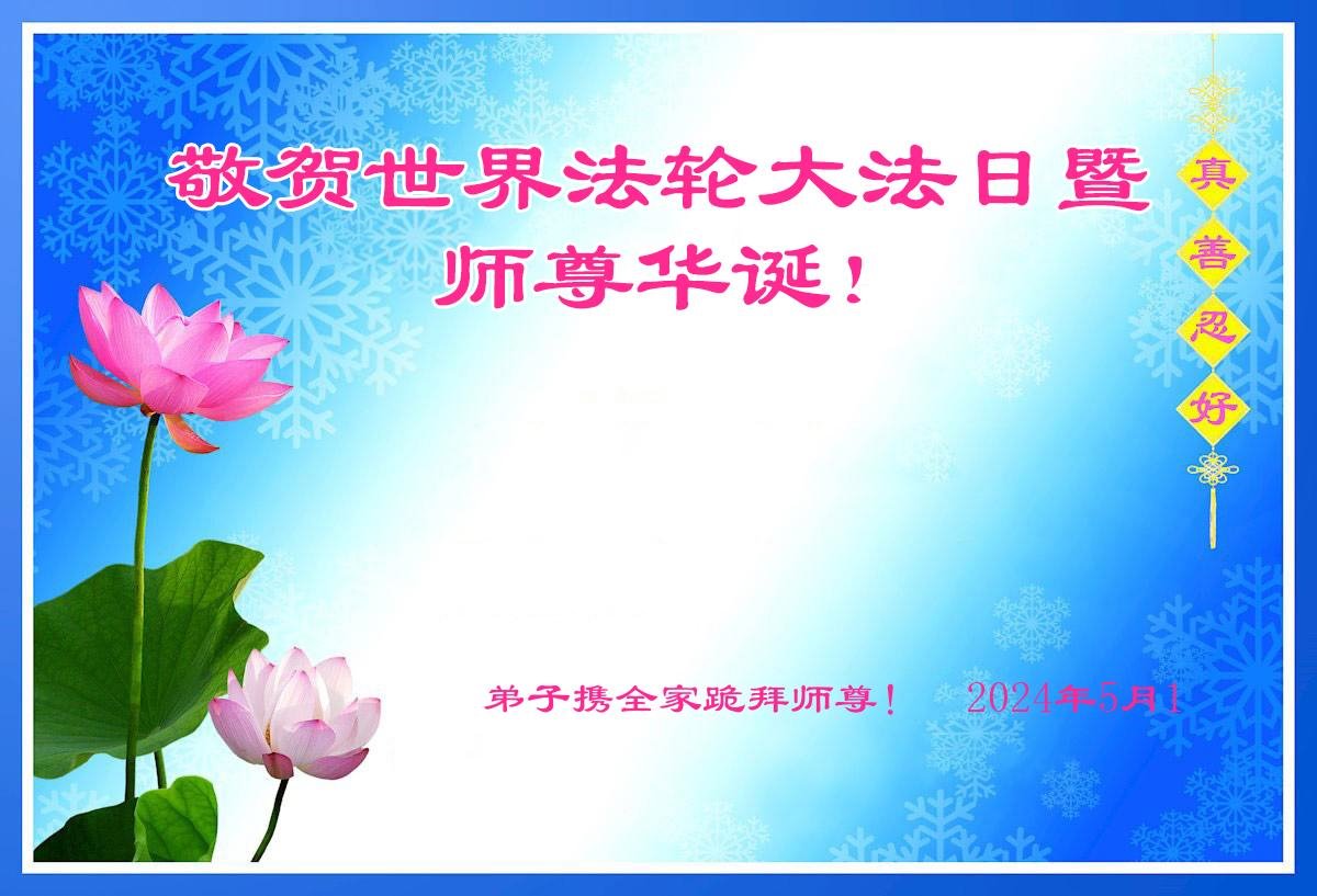 恭祝师尊华旦快乐!我是一名老年女大法弟子,今年八十岁。在师尊慈悲保护下,平安修炼三十年。我的身体健康、道德回升。家庭和睦、其乐融融。儿孙们都支持我做好三件事,全家人都感受到佛法无边,都在大法中受益。感恩师尊! 济南一老年大法弟子携全家叩拜 2024年5月9日 山东省济南市历下区大法弟子恭贺世界法轮大法日!
