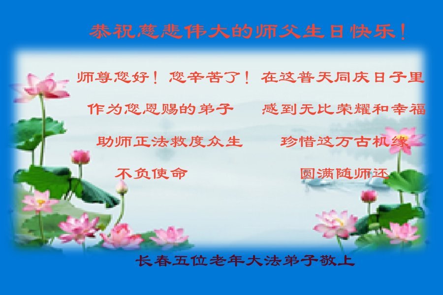 我们老年弟子的生命大多都是师父给弟子延续来的,是为了让我们精進修炼多救人。我们会努力配合好,多学法、多发正念,每天做好三件事,兑现誓约,完成使命圆满随师回到自己天上的家园。在世界法轮大法喜庆的日子里,恭祝师尊生日快乐! 吉林省长春老年大法弟子敬上 吉林省长春大法弟子恭祝师尊生日快乐!