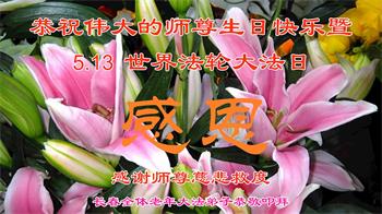 恭祝师尊生日快乐! 普天同庆五·一三世界法轮大法日。 师尊为众生又延续了一年的得救时间,弟子无限感恩又有这修自己救众生的机缘。唯有努力做好三件事,好一点再好一点,以报师恩。 长春大法弟子敬上 吉林省长春一大法弟子恭贺世界法轮大法日!