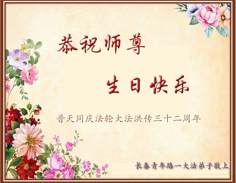 在法轮大法洪传32周年之际,我们迎来了师尊73岁生日华诞。在这里感恩师尊把我们从地狱中捞起,把我们的满身业力洗净。引领我们走上返本归真之路,成为宇宙大法中的一粒子。用人间所有的语言也表达不了我们对师尊的感恩之心。唯有做好三件事,兑现誓约,圆满随师还! 吉林省长春一大法弟子恭祝师尊生日快乐!恭贺法轮大法洪传全世界!