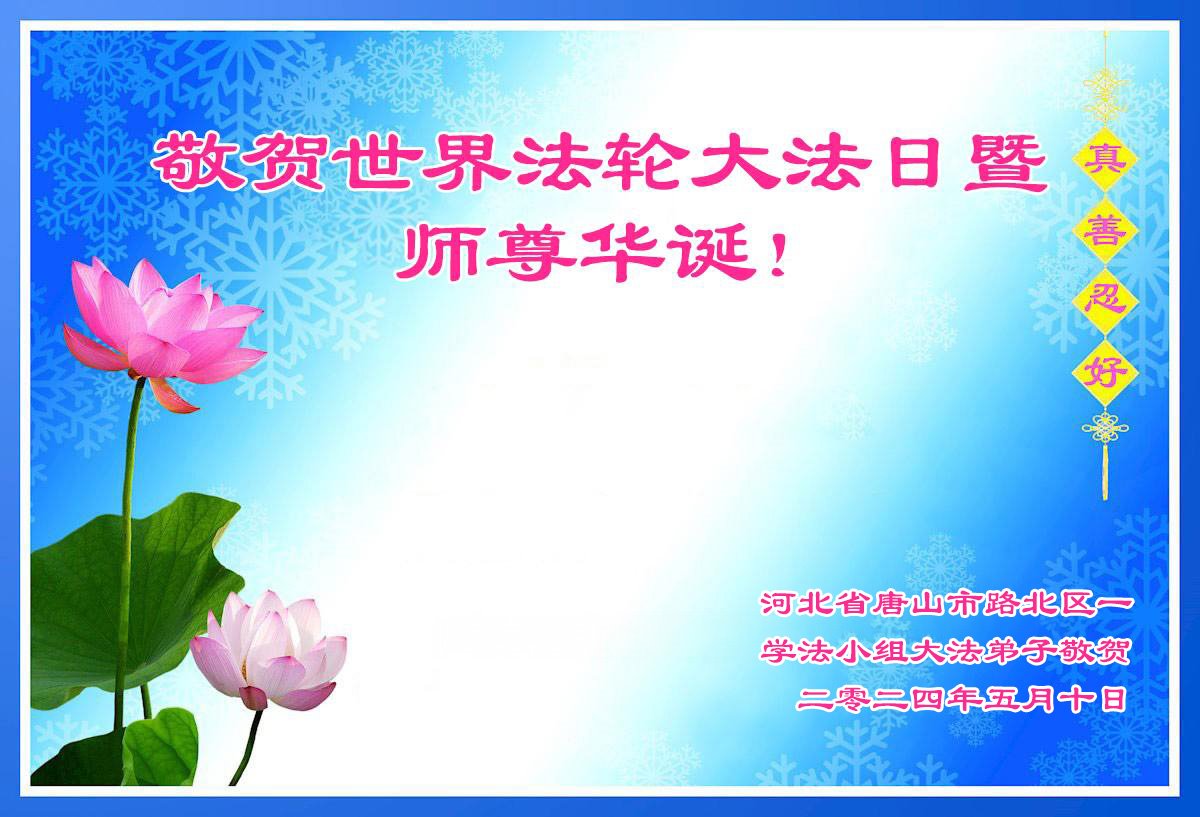 敬祝法轮大法洪传三十二周年! 恭祝师尊生日快乐! 河北唐山一大法弟子敬上 二零二四年五月十日 河北唐山市路北区一学法小组大法弟子恭祝师尊华诞及世界法轮大法日!