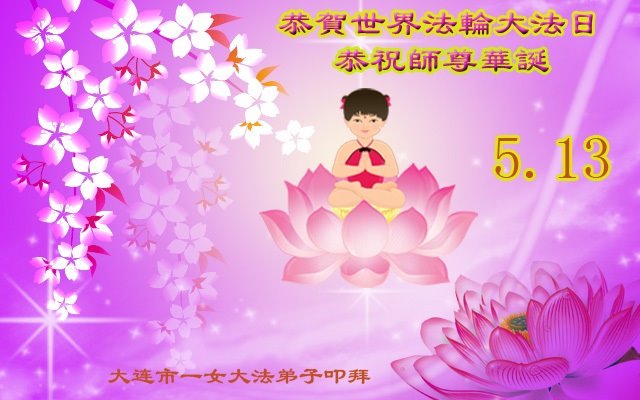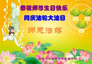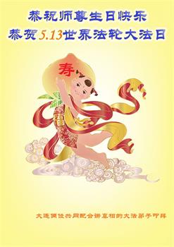 5·13法轮大法日及慈悲伟大的师尊生日来临之际,弟子衷心祝师尊生日快乐!感恩师尊对弟子的慈悲救度和保护。 辽宁省大连高新园区一家三位大法弟子恭贺世界法轮大法日暨师尊华诞!