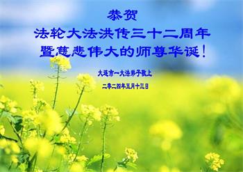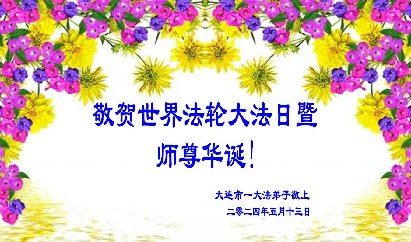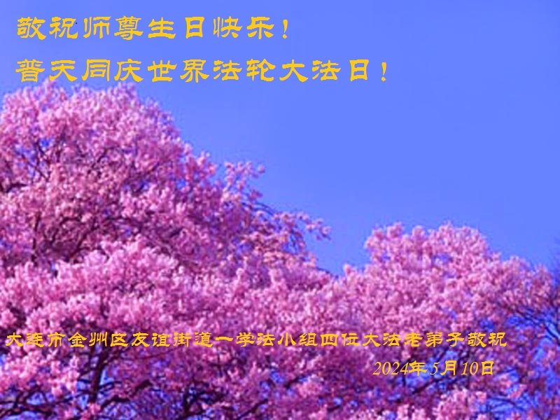 普天同祝、同贺! 感恩师尊救度,感恩大法!勇猛精進。 弟子跪拜师尊 辽宁大连沙河口区俩大法弟子敬上 二零二四年五月十一日 辽宁大连市一大法弟子恭贺法轮大法日!