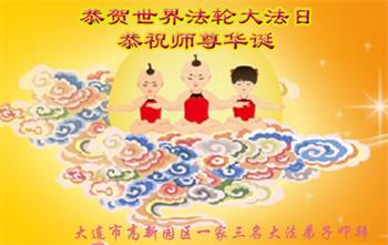 恭贺世界法轮大法日! 辽宁省大连三位大法弟子及家人恭祝慈悲伟大的师父生日快乐!