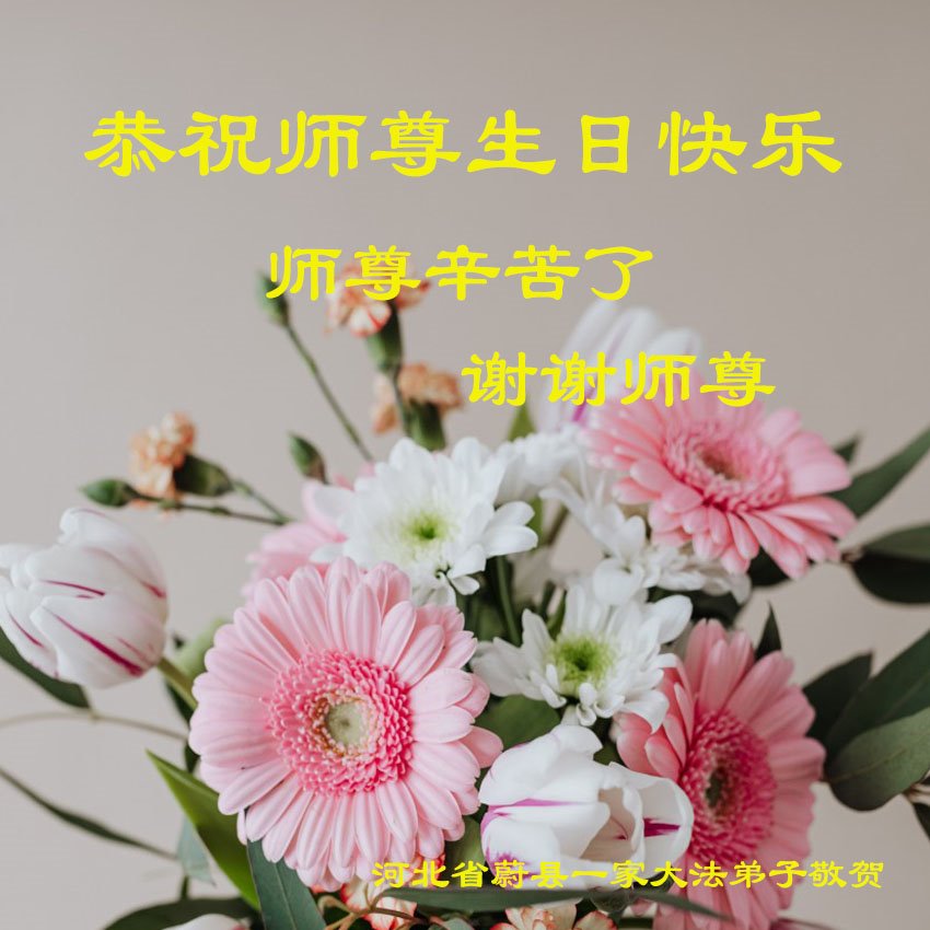 师尊您好!师尊辛苦了!感恩师尊为我们付出与承受,我们全体大法弟子在师尊的指导下,走正路,做好三件事,多救人,修好自己。听从师尊的话,互相救助,互相救人的同时度自己。在这末后的时期,我们整体配合,共同精進,共同提高,决不辜负师尊对我们的期盼。谢谢师尊! 河北省张家口市宣化区一学法小组大法弟子敬上 河北张家口市一大法弟子恭祝慈悲伟大的师尊生日快乐!庆贺世界法轮大法日!