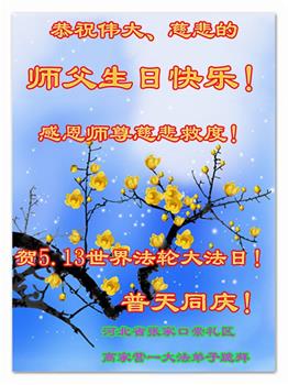 洪恩五月姹紫嫣红 普天同庆师尊华诞 佛光普照苍宇大穹 师尊指路永不迷航 沐浴佛光精進实修 法徒立掌邪灵灭尽 严寒酷暑救人不怠 传播真相九字真言 唤醒世人明辨善恶 师尊圣恩弟子铭记 修去执着兑现誓约 完成使命回归家园河北省蔚县大法弟子敬上 河北省张家口市阳原大法弟子恭祝师尊华诞暨世界法轮大法日!