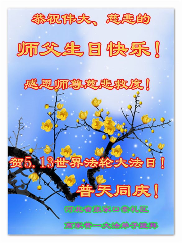 河北张家口蔚县两位女大法弟子恭祝师父生日快乐!恭贺5.13世界法轮大法日! 合十 2024年5月11日 河北省张家口崇礼区高家营一大法弟子恭祝师父生日快乐!