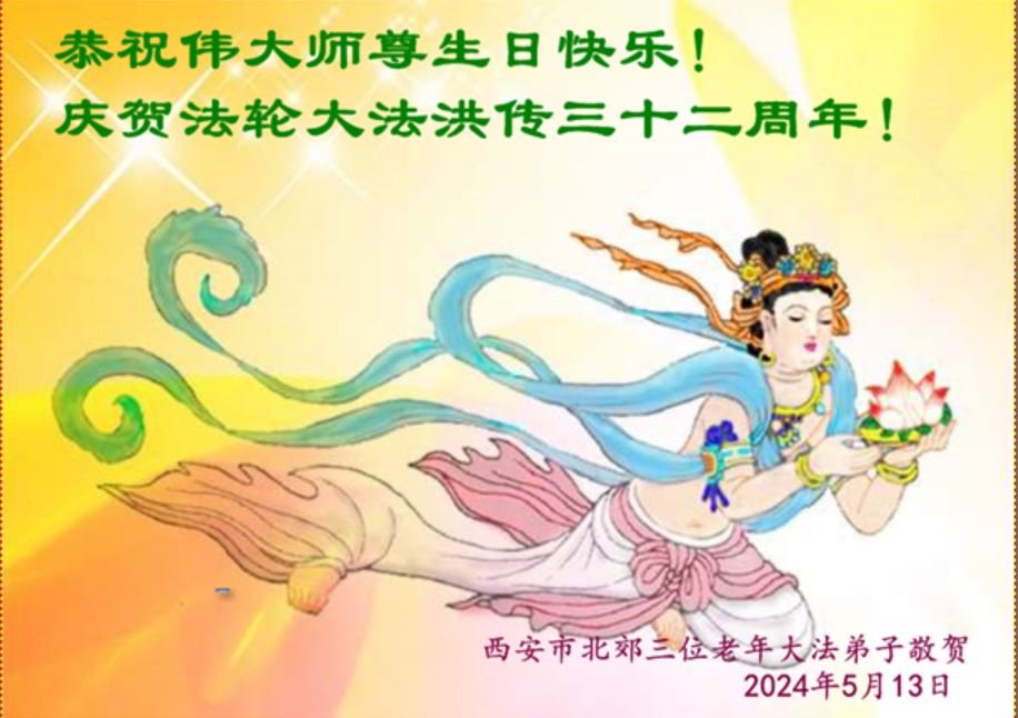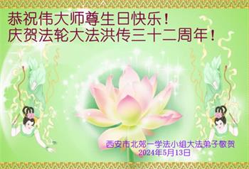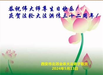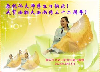陕西省西安北郊二环大法弟子恭祝伟大师尊生日快乐!庆贺法轮大法洪传三十二周年!
